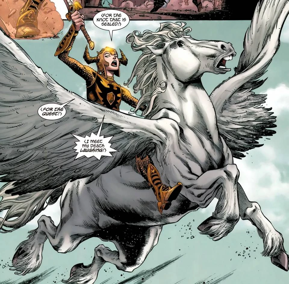 Vanguard es un pegaso blanco. Este conoció a la guerrera inmortal Shining Knight, convirtiéndose en su corcel para enfrentar juntos villanos a lo largo del mundo. Al parecer, en una de las batallas por la justicia Vanguard es mortalmente herido, para salvar su vida Shining Knight le da a beber de su propia sangre lo que lo vuelve inmortal al igual que ella, desde entonces se vuelve su compañero inseparable.[1]