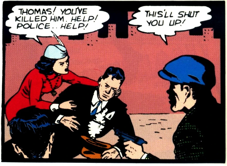 Enquanto voltavam para casa de uma sala de cinema com seu filho Bruce, Martha e seu marido Thomas foram abordados por um ladrão chamado Joe Chill. Tentando roubar suas jóias a Martha, Thomas Wayne tentou desarmar o assaltante. O assaltante matou Thomas e depois matou Martha.[1]