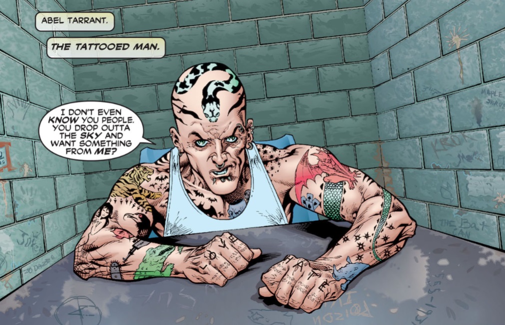 Abel Tarrant was a sailor based in Coast City who turned to burglary. During one of his heists, he was exposed to mysterious chemicals which left him with the mental ability to create actual objects from them. When he got back from the robbery, he tattooed himself using the chemicals so he would always have them near him. Some of the things his tattoos could conjure included axes, shields, cannons, and even a dragon.
