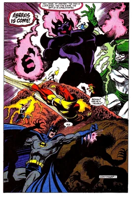 Unfortunately for Abraxis, Waverider was able to sense Abraxis' incursion and rallied heroes to stop him in the four time periods, but the Daemen were powerful enough to hold them off long enough for Abraxis to send his awareness into each of the simulacra. The Spectre, who was one of the rallied heroes, confronted Waverider and said that the heroes could not win unless they forced Abraxis to divide his awareness again, creating a fifth front - this one in his home dimension. When Waverider explained that he could not send additional heroes without damaging the time line, Spectre told him of the Justice Society of America who were, at the time, trapped in a limbo dimension. The two of them were able to freeze the limbo long enough for the JSA to fight Abraxis. During the battle, the JSA brought god-like energy and imbued it to the natives who were able to join the fight. The final fate of Abraxis was never verified but it's likely he was killed during the assault on his homeworld. The Daemen were taken by Waverider to the limbo dimension and left them in the JSA's place forcing them to fight for eternity to save the universe while the JSA returned home.