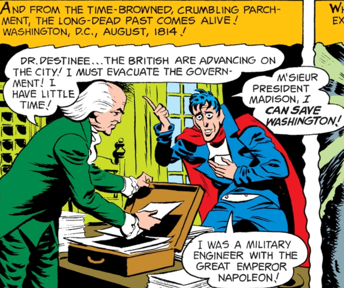 In 1814, Destinee approached President James Madison and offered his services to repel the British invasion. He showed him his artifact and swore that he could save the capitol. Madison rebuked his offer believing Destinee to be little more than a crackpot. Destinee decided to take matters into his own hands, so he rode off towards the Capitol Building determined to destroy the British soldiers. One soldier got the drop on him however, and fatally stabbed him with his bayonet. Before dying, Destinee hid his artifact inside the dome of the Capitol Building and swore that he would rise from the grave to haunt those too ungrateful to accept his aid.