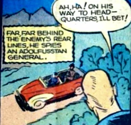 In 1940, King Adolfus made the disastrous mistake of invading a neighboring European nation. Adolfuss was immediately invaded by a foreign super hero, Master Man, who handily defeated all of the Adolfusstan armed forces, that same day. Adolfus himself, however, was a superhuman battler, and he duked it out with Master Man for three full hours. Finally beaten, Adolfuss called off his war, and was exiled for all time.