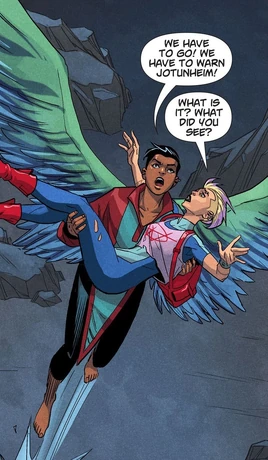 Informing Raza and Manticore about the coming horde led by Black Adam, they advised to flee the fortress. Raza disagreed, believing it was a bad idea and Wink told them to fly to the Aegean Sea where they could reach Themyscira and get other heroes to help them. Aerie quickly flew to the area and was found by Wonder Woman, who rushed to Jotunheim after hearing they needed help.[2]
