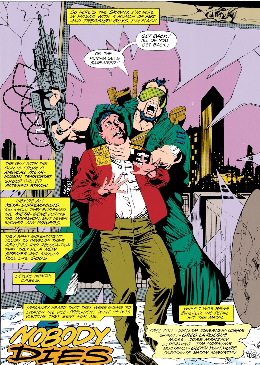 Altered Strain attempted to bribe the Government into giving them money by sending Quentin Eastly to Frisco to kidnap the vice-president, but he was stopped by the Flash. Altered Strain then attempted to kill the Flash by destroying the plane that he was travelling on. However, the Flash beat the two members that Altered Strain sent to kill him.