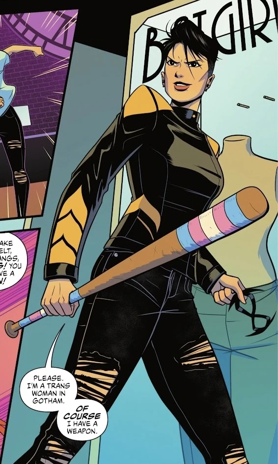 Alysia Yeoh is a close friend and former roommate to the superhero Batgirl in her secret identity as Barbara Gordon. She is a transgender woman of Singaporean descent and describes herself as somewhat of an activist painter, when she's not at her night job bar tending. At the time of her debut appearance, Alysia was noted for being the first major transgender character written in a contemporary context in a mainstream comic book. Her and Jo Muñoz's wedding in Batgirl (Volume 4) #45 was also the first ever transgender wedding to be depicted in a comic book.