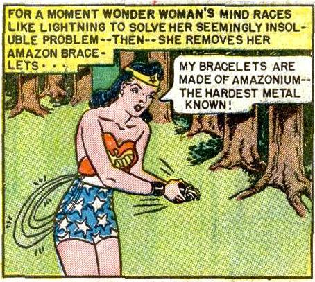 Amazonium was the Pre-Crisis name of the indestructible metal used for the construction of Wonder Woman's Bracelets[1], Tiara[2] and Magic Lasso.[3]