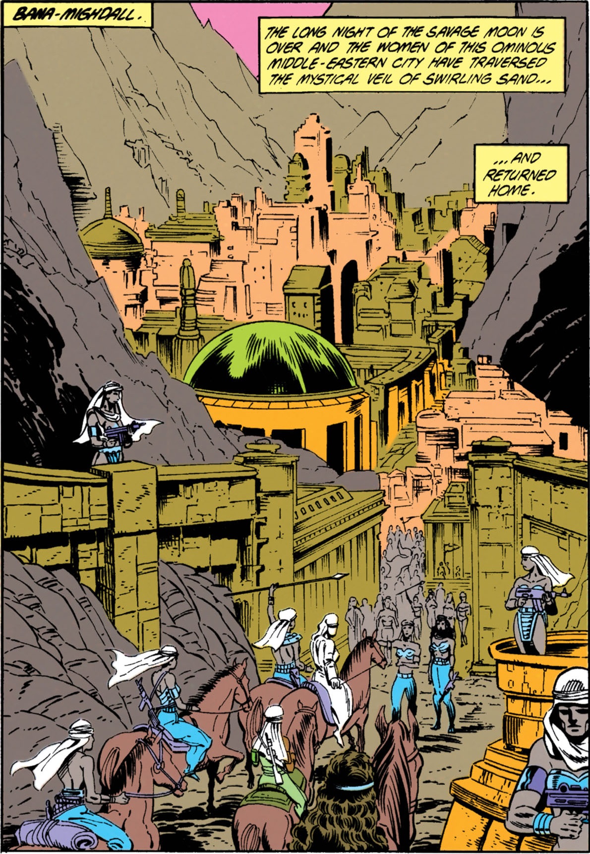 After fighting with the Trojans against the Greeks in the Trojan War, the Amazons wandered for many years, eventually settling in the deserts of Egypt. There they built a great city of mosques and temples and called it Bana-Mighdall, which means "The Temple of Women" in the hybrid language of the lost tribe. The Amazons appealed to the goddesses of Egypt to grant them sanctuary, and their city became magically protected by a constant swirling sandstorm. Having renounced their immortality upon leaving Themyscira, the Amazons decided that the best way to continue their race was to kidnap men from surrounding cities for use in breeding. Captive men were kept in breeding stables like animals and only called upon when their reproductive services were of need. Male babies were killed, but the female babies would be raised in the increasingly violent and war-loving ways of Bana-Mighdall.