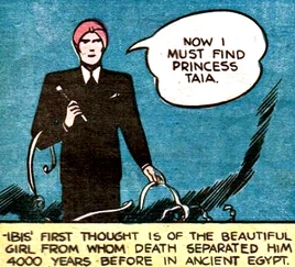 Ibis began his life as Amentep, a prince of ancient Egypt who was in love with the beautiful Princess Taia of Thebes. As a young man, Amentep had been given the Ibistick, a talisman of incredible power, by the Egyptian ibis-headed god Thoth, who empowers the talisman. Amentep's throne was eventually usurped by a cruel magician known as the Black Pharaoh, who shot Taia with a poisoned arrow. Using his Ibistick, Amentep placed his beloved in suspended animation to allow her to heal. He soon cast a similar spell upon himself, hoping to be present when Taia revived.