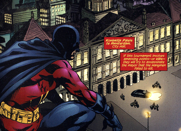 Amsterdam was the target place of the team of assassins known as the Council of Spiders for the murder of several political figures. On a final battle near the City Hall, the Council was defeated by the vigilantes Red Robin and Insider.[1]