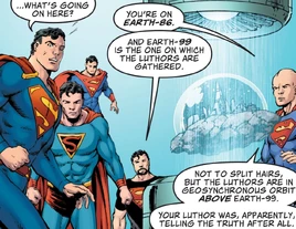 Clark explained his dopplegangers what Luthor told him, saying he believed him: in fact, the Luthors gathered on Earth-99 so the Supermen of the Multiverse left Earth-86 to enact a surprise attack on the supervillains.[1]