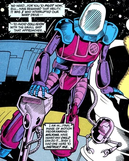 Artin was constructed by the Psions on Wombworld as a computerized majordomo.[1] He gained sentience and merged for a time with Primus, but is now independent. He decided to remain with Omega Men on the planet Kuraq, the Omegan refuge. He was later destroyed by Lady Styx's Darkstars.