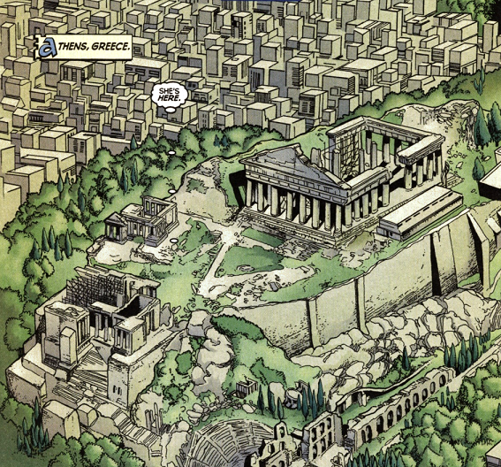 Its most famous monument is the Parthenon on the Acropolis, a temple dedicated to the goddess Pallas Athena, patron goddess of the city in Antiquity and from whom it got its name. The city also has the Areopagus hill, which exists both on the physical plane and in a sub-dimension like Mount Olympus, and is home to the war god Ares.