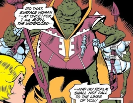 He forged an alliance with the Injustice Society with the intention of taking control of the world's resources in revenge for what he saw as the rape of his realm by surface dwellers digging for oil, but his attack was repulsed by the Justice Society and in particular by Power Girl, who defeated Ayrn in physical combat.