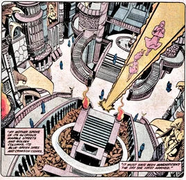 It was once a veritable paradise, with blue-green skies and crimson clouds. The streets were paved in solid marble and the buildings were accented with columns of pure gold. Hundreds upon hundreds of years ago, a mysterious woman known as Azar convinced a group of Earth humans to abandon the ways of man and embrace a world of peace and prosperity. Whether Azar was herself a native of Earth, or whether she originally hailed from Azarath itself has never been revealed. Leading her charges from Earth to Azarath, she guided and taught them the ways of peace for more than two centuries. These men and women established the Temple of Azarath and formed a mystic society. Ages ago, they decided to purge their bodies of all evil. Using mystical incantations, they exorcised the darker passions from the souls and cast it out beyond the Great Door into Limbo. These discarded dark emotions did not dissipate into the ether, however. They coalesced and merged together, flowing between the endless dimensions beyond the Great Door. In another dimension, these dark forces were summoned during a mystic ceremony and they took physical form for the first time. This being called itself Trigon and proved to be an incomprehensibly strong and powerful inter-dimensional demon of the highest order.