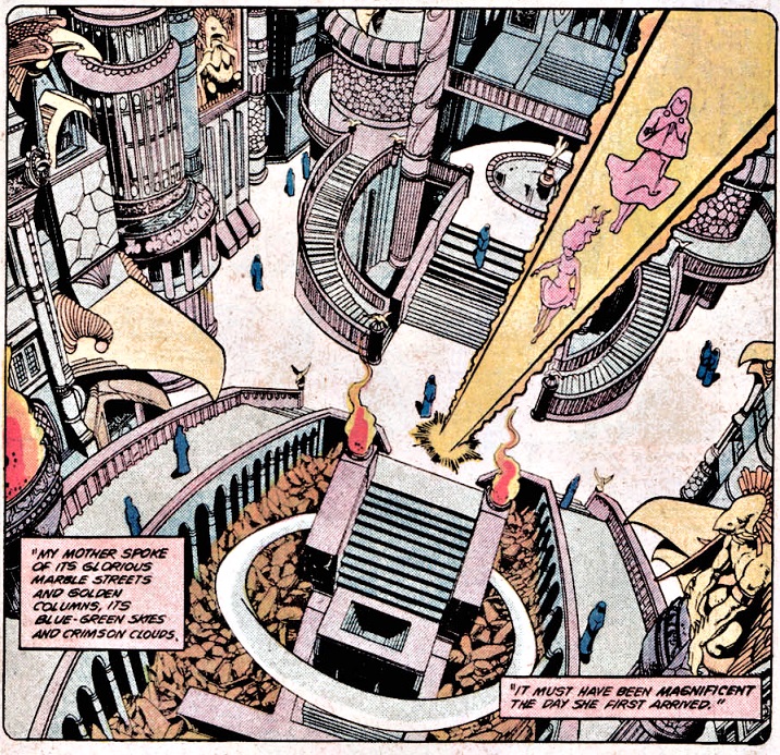 Over two decades ago on Earth, a woman named Angela Roth had fallen in with an occult circle. Though they were rank amateurs in the field of Satanic ritual, they nevertheless attempted to summon the Devil. What they succeeded in conjuring was far worse. Trigon emerged and took Angela Roth as his bride. He left her pregnant with his child then abandoned her, patiently awaiting the day when he could call his offspring to his side. Trigon manipulated the priests of Azarath to journey to Earth in search of Angela Roth. He knew that the mother of his soon-to-born child would be safe under the care of these pacifists. They found Angela and brought her to Azarath where she was renamed Arella (the Messenger Angel).