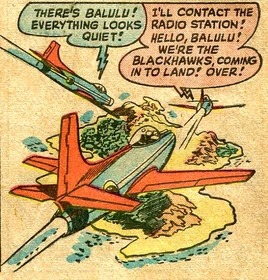 In 1949, Red agents took over the island of Balulu at gunpoint, assassinating some officials and arresting others, and imposed martial law. The Blackhawk Squadron was alerted to this situation by one Baluluan citizen, and intervened, with handguns and a howitzer. After a prolonged gunfight, the townspeople of the island's capital were able to regain control of their city. The leader of the foreign agents, "Twilight," shot herself dead.