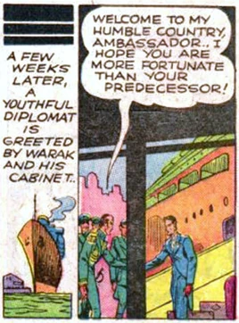 Wendall did some quick and efficient espionage, and confirmed that the Barbarian government was commissioning the giant warplanes, which operated from a secret airdrome, built into the side of a mountain. He infiltrated this base, and slipped aboard the giant aircraft, and was present for the big plane's test mission, which was a bombing attack on a previously-evacuated small town. A fight and a chase took place before Wendall was able to steal a small Barbarian fighter plane, which was armed with incendiary bombs, which he used to set fire to the hidden airdrome. In a last-ditch attempt to fly the prototype flying wing to safety, Warak personally took the controls and took off. He flew toward the open sea, pursued by the American spy, who brought down the giant plane by crashing his own stolen fighter into it. The Dictator Warak was apparently killed. The American agent parachuted to safety, at sea.