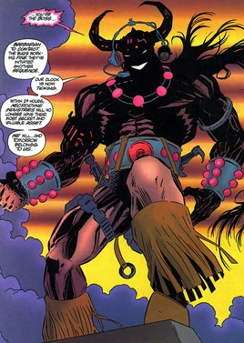 Barbarian was tasked with stealing Incarnate from Necrodyne Industries. When Manhunter was hired by Necrodyne to find Incarnate, he ran afoul of Barbarian but Barbarian escaped with the help of White Lotus.[1] Manhunter's compulsion to hunt made him track Barbarian to Nevada. Once he had tagged Barbarian, Manhunter's need to hunt was sated and he tried to leave. In the mean team, White Lotus recognized Incarnate, rescued him, and tried to escape in her helicopter. Barbarian took it personally and hacked it out of the sky over a dam. White Lotus returned the favor by shooting down his own helicopter. Not finished, Barbarian murdered White Lotus by blowing up her jet-pack and began fighting with Manhunter again on the edge of the dam. He was killed when part of the dam gave way due to all the explosions and he was pushed over the edge.[2]