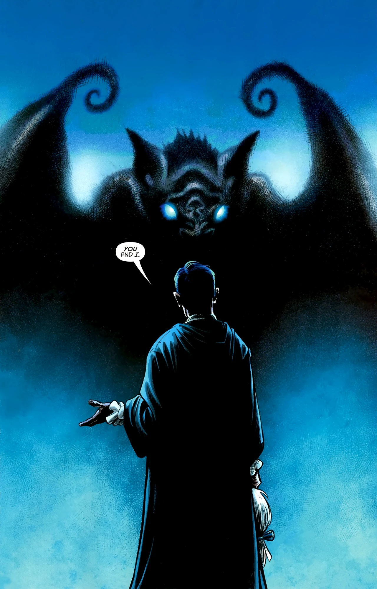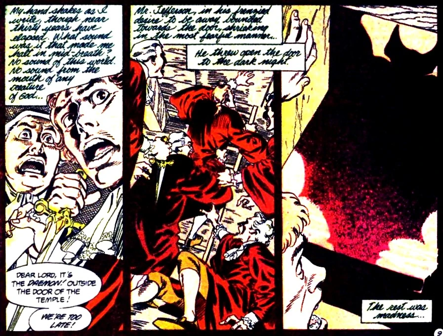 The Riddler captures Batman, explains the ritual, and prepares to sacrifice him. They are both startled when Barbathos speaks. Barbathos explains that he is the spirit inside Gotham, and he created Batman to one day release him. The Riddler flees in terror, seals the tomb, and sets fire to the building. Barbathos shows Batman a vision of the occultists. He explains that Batman and Dominique are brothers and sisters of the bat. The winged creature that attacked the occultists was a normal-sized bat, it only seemed like a monster because they were terrified. Alfred Pennyworth arrives to open the temple, and Batman helps Dominique's spirit escape. Her remains are buried inside the Wayne private cemetery. Batman decides that it does not matter if a demon was behind his origins, because those experiences were real and they made him who he is.[3]