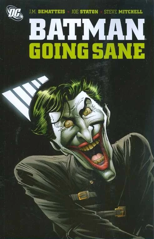This paperback collects the "Batman: Going Sane" storyline from the comic book series Batman: Legends of the Dark Knight (Volume 1). The storyline was written by J.M. DeMatteis and illustrated by Joe Staton and Steve Mitchell. It was published from November, 1994 to February, 1995. In this storyline, the Joker seemingly kills Batman after a life-and-death struggle. Faced with the loss of his nemesis, the insane Joker can only retreat into sanity.