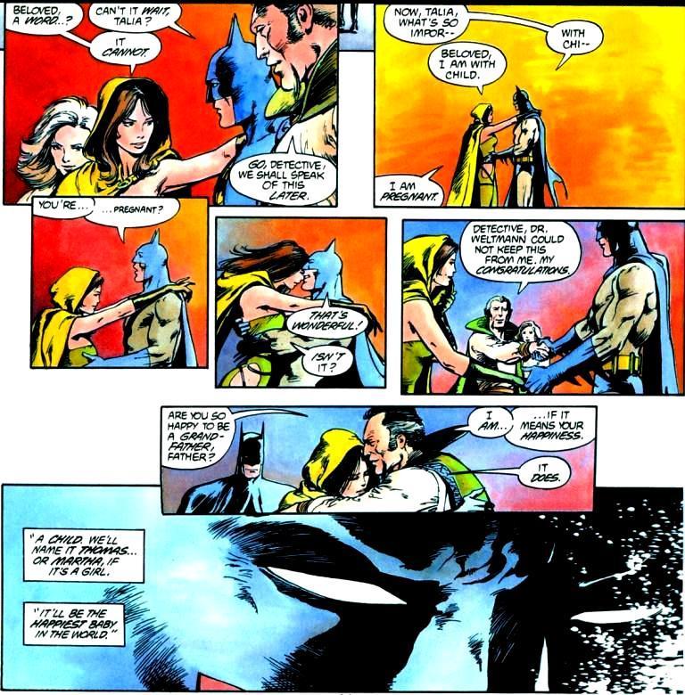 - Batman and Talia's son has a strange place in continuity. In Batman: Son of the Demon, Talia and Bruce had consensual sex and she got pregnant. Bruce knew about her pregnancy, but she later lied and told him she had miscarried. Talia gave the baby to an orphanage, and he was adopted by an unnamed couple. The baby's name was never given. After Zero Hour (1994), Dennis O'Neil announced that this entire story had been retconned out of existence: Talia had never been pregnant and Bruce had no children. In the books Kingdom Come (1996) and The Kingdom: Son of the Bat #1 (1999), set in an alternate future, Bruce and Talia have an adult son named Ibn al Xu'ffasch, but (at the time) this was an Elseworlds story so it had no impact on continuity. After Infinite Crisis, Grant Morrison retconned the child back into existence, with altered details. As revealed in Batman #656, Talia had drugged Bruce and had sex with him in order to conceive a child as part of a eugenics experiment. She named the child Damian. Bruce never knew she was pregnant, and he didn't learn about Damian until years later.[1] Morrison admitted that they did not read Son of the Demon beforehand and instead handwaved the changes as effects of Infinite Crisis.[2]