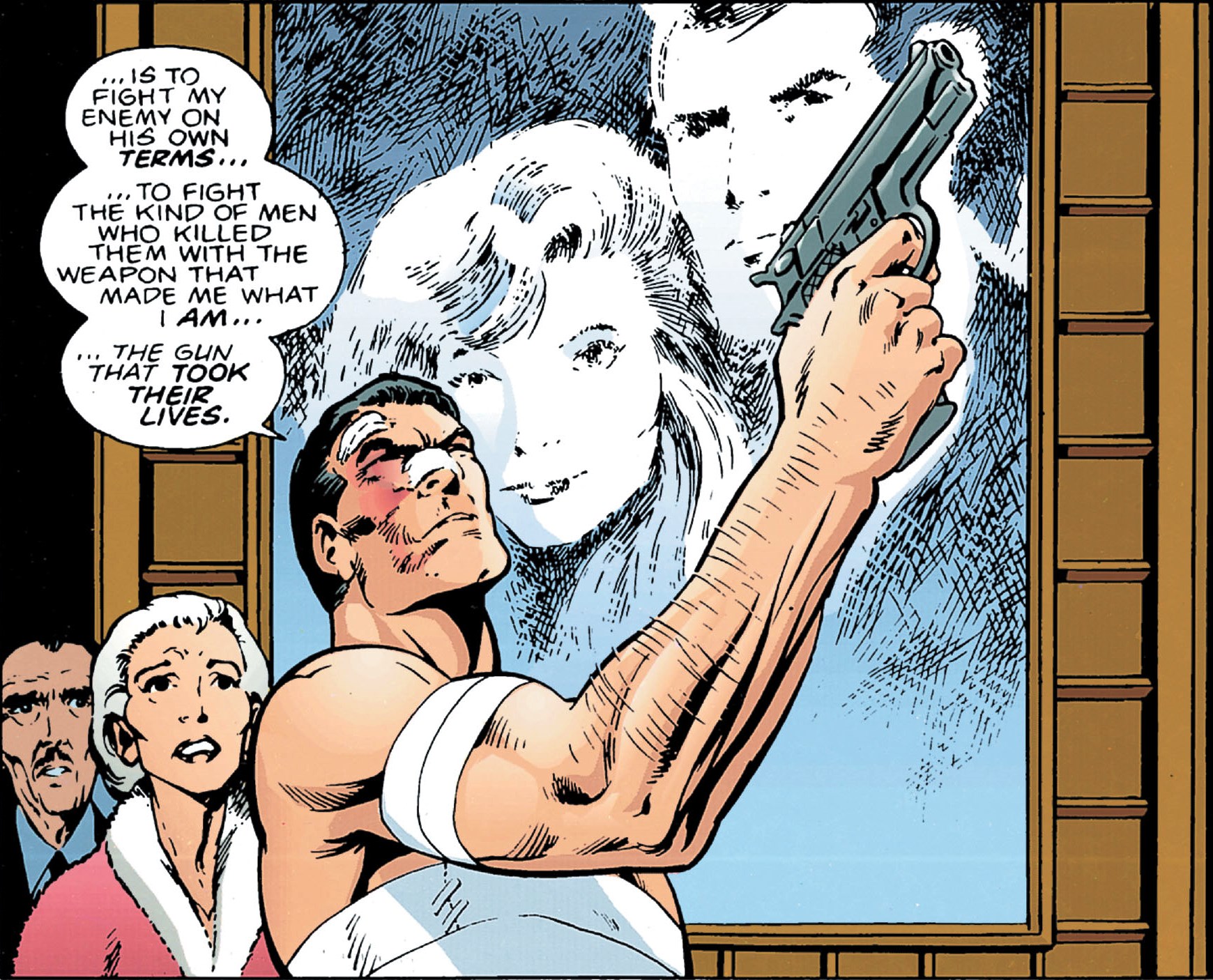 Going to Bank Street, where the Reaper was first spotted, Batman locates the Reaper about to murder some prostitutes and he stops the killer. During the ensuing fight, Batman is beaten to a pulp and massacred by The Reaper, whose armor and weapons make him a formidable opponent. Batman is barely able to escape alive via the sewer system. Batman manages to crawl back to Wayne Manor, where Alfred and Leslie heal his wounds until he fully recovers. Upon recovering his strength, Bruce takes the decision to fight fire with fire and he chooses to confront The Reaper using Joe Chill's gun, the same that murdered his parents and he later retrieved from the crime scene.