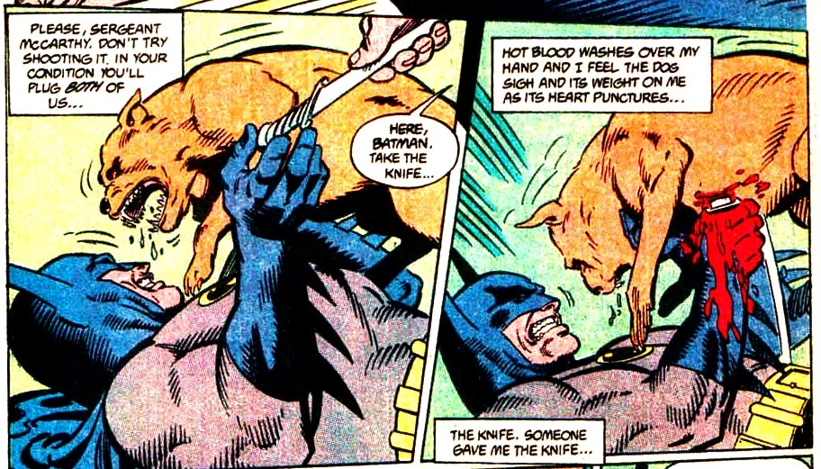 The Riddler prepares his henchmen for the next task. Batman begins interrogating people on McKinley St. in the local bars. Suddenly a van crashes through the window, releasing several pit bull terriers. Batman fights the dogs to protect the civilians. Somebody hands him a knife, and without thinking he uses it to stab one of the dogs. He realizes the knife is silver, and the man who handed it to him is getting into the van. Batman chases the van down the street and climbs into it. There is nobody driving, but the Riddler contacts him by radio. This time the Riddler gives his exact location, and explains the baby is about to die. Batman races to find the Riddler. The Riddler places a ping pong ball inside the baby's throat so it will choke to death. Batman goes into the sewers to find the Riddler, and he is blinded by bright lights. Two more henchmen attack him with bats. Batman defeats these goons and sees the Riddler holding the choking baby. The Riddler escapes while Batman tries to save the baby's life. The baby cannot breathe, and the ping pong ball is wedged tightly with no way to get it out. Batman realizes his only option is an emergency tracheotomy.