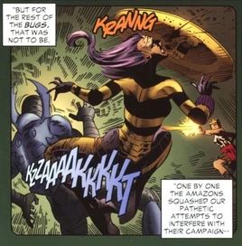 Queen Bee was a member of the Ambush Bugs, a team of rebels that attempted to repel the Amazons from invading England.
