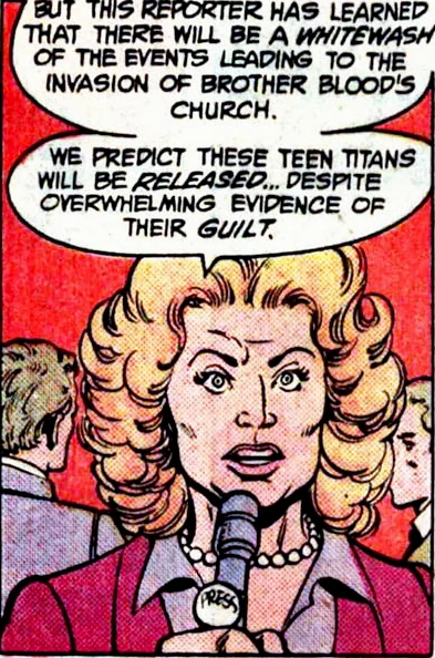 Bethany Snow is a member of the Church of Blood, whose mission as a WUBC reporter was to report favorably on the church and shift attention to perceived crimes of the Teen Titans.