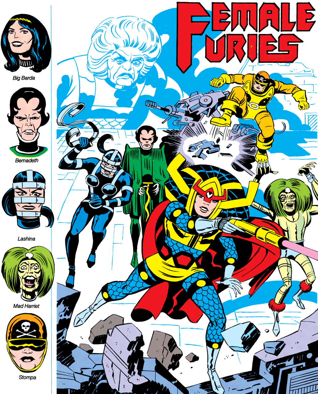 Barda was born of the race of New Gods about 250 years ago, on Apokolips. She is a product of Granny Goodness' Home for Orphaned Youth. Granny's motto is "Die for Darkseid" (the planet's evil ruler). Granny grooms Barda to one day lead the Female Fury Battalion, a ferocious pack of women warriors. However, during a raid Barda meets Scott Free, Darkseid's adopted son, and, sensing a peace about him, falls in love.