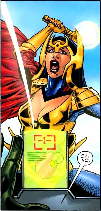 However, when Kara Zor-El is kidnapped by Darkseid, Barda accompanies Batman, Superman and Wonder Woman to Apokolips to rescue the young Kryptonian from his clutches[3] and fights the Female Furies together with Wonder Woman battle the Female Furies.[4]