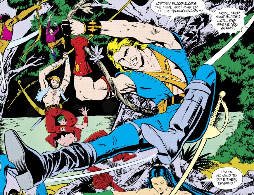 He initially took Arion, Chian, Wyynde, Mara, and Nightfire hostage, intending to ransom them back to Atlantis. Arion challenged Bloodmoor to combat, and after defeating the pirate, Bloodmoor welcomed them to stay on his ship as friends. Eventually, the group left to return to Atlantis but Nightfire decided to stay aboard and sail with the Unicorn.[1]