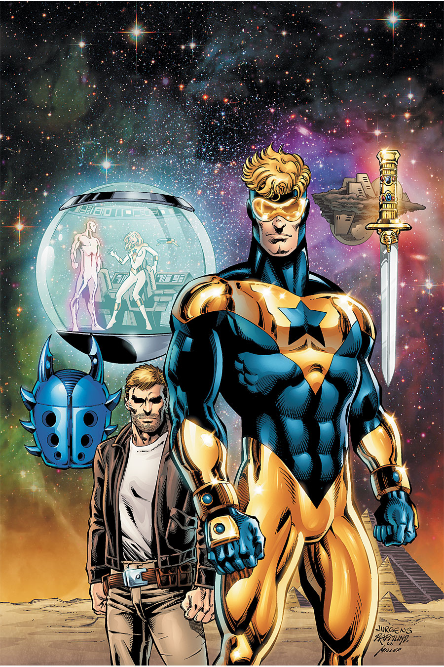 Booster Gold is a time-traveling super-hero from the 25th Century who uses high-tech equipment to fight crime, alongside his robotic side-kick Skeets. His best friend and most regular partner is Blue Beetle. Not taken very seriously by his peers because of a careless and somewhat egotistical attitude, he is frequently under-estimated. Briefly taking the alias Supernova during 52, he begins secretly working with Rip Hunter as a guardian of the timestream. A rement of Michael survived Flashpoint and during Convergence, took on the role of Waverider. He has been a member of the Justice League, Time Masters, Conglomerate, Extreme Justice and Super Buddies. Booster Gold was created by Dan Jurgens, first appearing in Booster Gold #1. (1986)