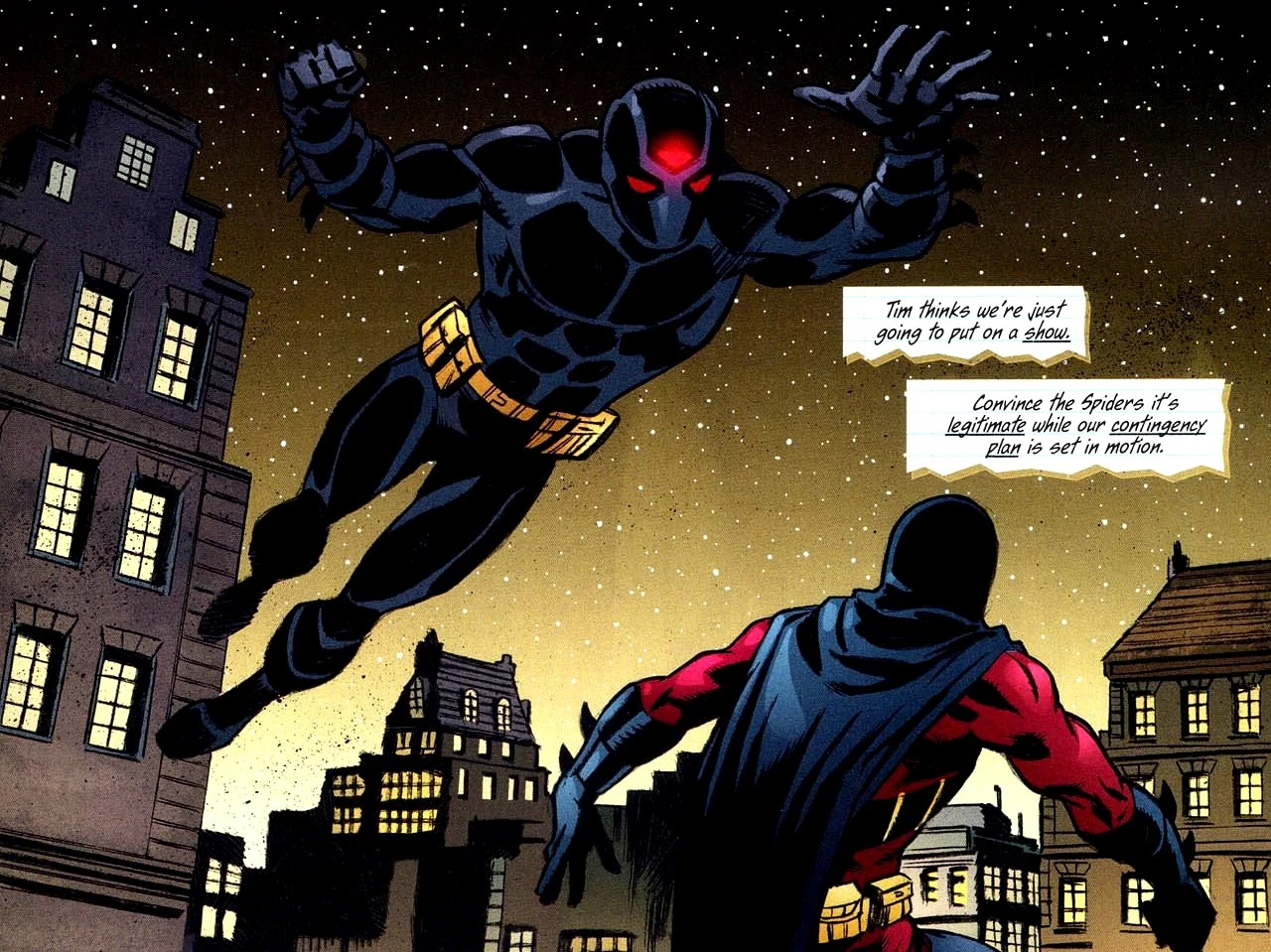 Red Robin was waiting outside Amsterdam's city hall, expecting an attack from the Council when he is attacked by the Insider and they start a staged fight to eliminate any suspicions. The battle intensifies and Tim understands that Bruce wants to test him, so he fights back with all his ability. While they are fighting, Prudence starts taking down the other members of the Council one by one. She uses a taser to stun Funnel and use some of her poisons to attack Goliath. Wolf is reached by one of Insider's attacks and when almost all of them are eliminated, Red Robin and Insider knock out Goliath.