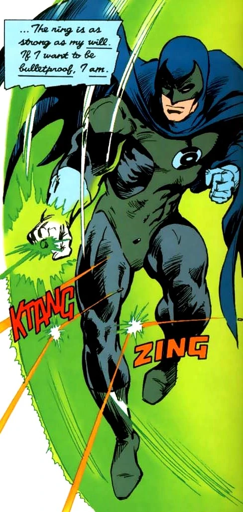 After Bruce Wayne's disastrous first attempt at crimefighting, while he sat in his study, wounded, he pleaded with his father for some means by which to terrify the criminals of Gotham City. Suddenly, a ghostly image comes from a bust before him, telling him that he has been chosen. At first, Bruce assumed that he is delirious from blood loss, but the figure healed his wounds and led him to a crashed rocket on his property. Inside, the dying Green Lantern Abin Sur gave Bruce his power ring and told him to wait for contact from its masters. Bruce hid the rocket in the cave beneath his mansion and begins his crimefighting career as Green Lantern.