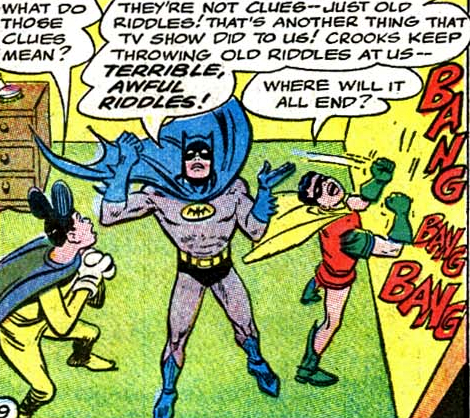 When the Batman TV series became suddenly popular, Batman and Robin's workload increased, because of an increase in new super-villains and super-heroes inspired by the show (the Dynamic Duo had to save the new heroes from their own incompetence). One of these cases involved heroes Ratman (Jerry Lewis) and Rotten (Renfrew) and the villain Kangaroo (Witch Kraft). At the end of the case, Batman let the Kangaroo go, because she was only doing it to teach Ratman a lesson -- and because she had captured the Joker, the Penguin and the Riddler for him![1]