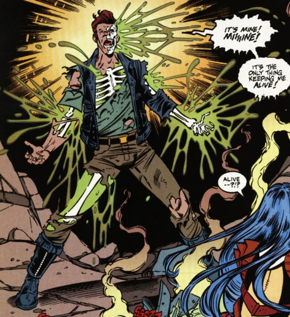 He wasn't dead for long however, as Byron was brought back to life by the alien matter that leaked from the ship onto half his body, or at least about halfway. The strange glowing ectoplasmic slime now makes up about half of his body. He has vowed revenge against the aliens for the death of his girlfriend, who was pregnant at the time.
