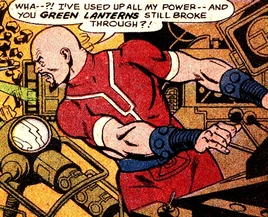 Captain Challenge traveled from Earth-Two to Earth-One to try and commit crimes, but Hal Jordan called in his pal Alan Scott, the Green Lantern from Captain Challenge's universe. During the fight, Hal had to hold back because Challenge used a ray that fires yellow beams. However Alan -- his power-ring having no weakness to yellow -- stepped into the fray and easily defeated his foe.
