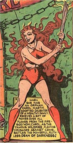Orphaned in a forest fire in which she herself almost died, Carol Vance was saved by the Lord of Fire, who gave her the power to control and create flames. She was adopted by the wealthy Martin family and as a teenager decided to use her powers to battle injustice as Wildfire. She was active in the early 1940s, battling foes such as the Flame Cult[1] and the Dean of Darkness.[2]