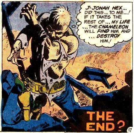 The Chameleon is a 19th Century criminal and an enemy to the gunslinger Jonah Hex. He is known as an incredible master of disguise. Quentin Turnbull hired the Chameleon to assassinate Hex. This encounter went poorly, and it ended with Hex damaging the Chameleon's face beyond repair. Chameleon was created by Michael Fleisher and Jose Luis Garcia-Lopez, first appearing in Jonah Hex #4. (1977)