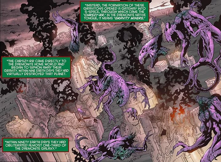 Thousands of years ago the Daemonite encountered the Chrszy-RR. The gravity miners robbed the Daemonite home world of much of its gravity; within nine Earth days they had virtually destroyed that planet. Within ninety earth days they had obliterated almost one-third of the Daemonite Galaxy until they were finally pushed back. They returned recently, with Apollo as their prisoner.