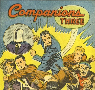 In Castillo, South America the trio of trouble-hunters took part in the overthrow of presidential usurper Forzo and the re-inauguration of his predecessor, President Alvarez.[12] They traveled to New Orleans and then to Rio Sambu, Panama, to take down two grave-robbing schemers calling themselves "2 Dark Men."[13] They boarded the Japanese battleship Kihua to rescue Dr. Horace Linden, inventor of the famous Ray Gun.[14] At a circus they got drawn into a murderer's frame-up, and teamed up with a lady lion tamer to expose and capture him.[15] At the Latham Machine Works they encountered a gang of Nazi agents, and under the factory they found a productive helium well, both of which they turned over to the federal authorities.[16] Returning to Central America, and posing as fugitives, the three adventurers infiltrated and destroyed the operations of Senor Muerte, an outlaw rubber baron, capturing a tremendous stockpile of rubber in the process.[17] And in their last recorded adventure, in Greenland, the Companions Three made innovative use of a large volume of very bad smelling whale blubber to capture a Nazi U-boat crew.[18]