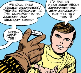 The Cosmic Cartridges are components of New Genesis technology. Bullet-like in appearance, Serifan carries them in his hat.