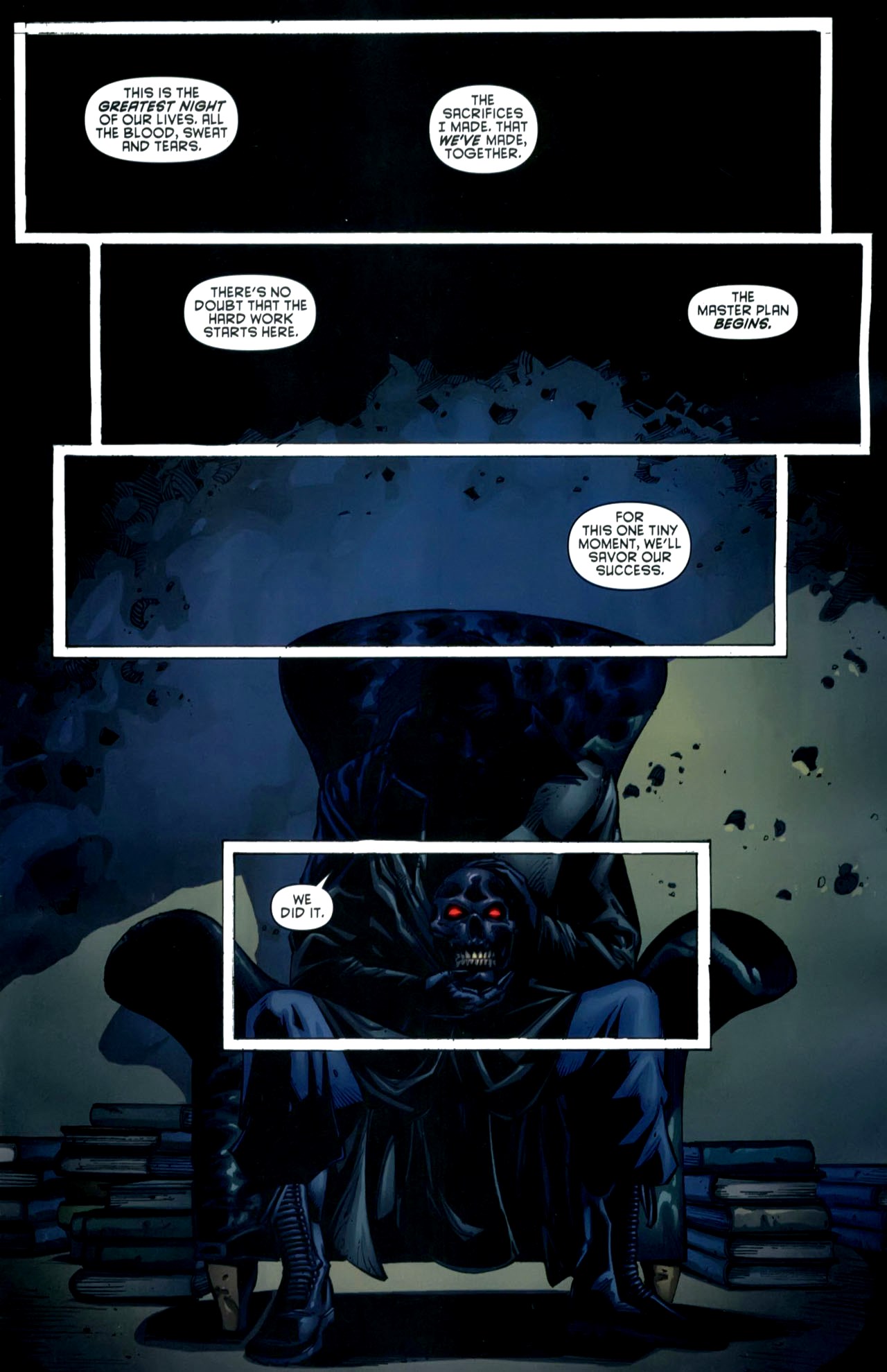 Batman swings across the Gotham skyline, and Damian confronts him wearing a Robin costume. He declares himself Batman's new partner and explains they must work together to stop his mother. Bruce asks what happened to Tim, and Damian lies that he quit. It's shown that Tim is still lying in a pile of bloody glass in the Batcave.