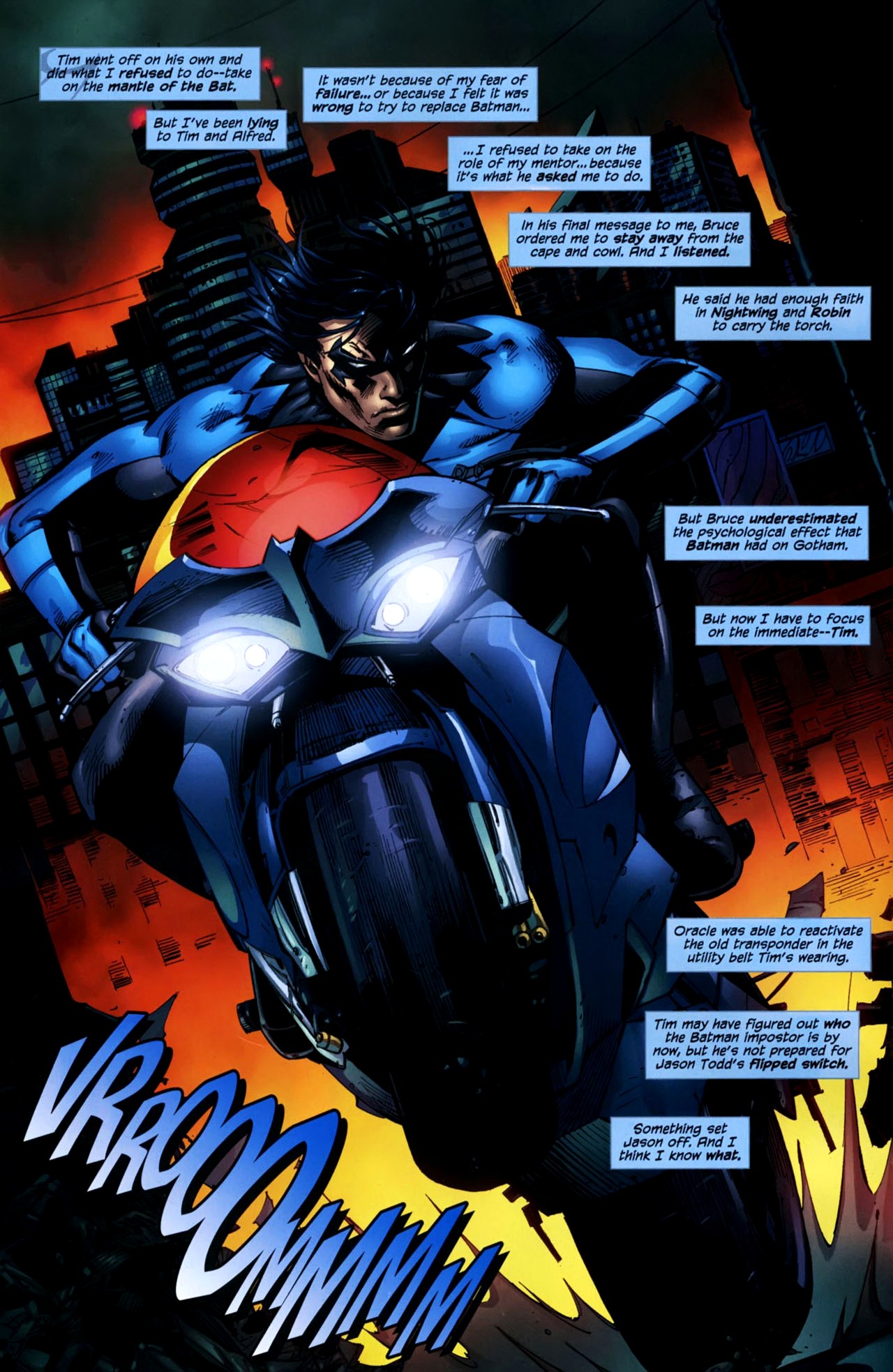 Nightwing travels across Gotham City to meet The Network and in the meantime, he starts thinking who could be the person responsible for the chaos and destruction created. He soon comes to the conclusion that whoever it is, is someone new and it must be stopped. He informs the Network about this new threat and he leaves Huntress in charge of the team to find and stop whoever is behind it all. While the Network are busy trying to locate the new villain, Nightwing gets on his way to find and stop and old acquaintance. As he rides on the Batcycle, Nightwing remembers that the only reason he has not taken the mantle of the Bat is because Bruce asked him not to on his last message.