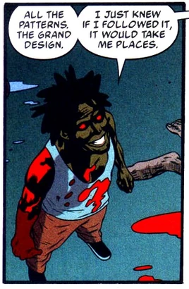 Empowered by the Demon Lord Cthugha, he and the Skarva fought and subdued Etrigan, dragging patients and staff alike towards a summoning circle to sacrifice to Cthugha. Despite this, the symbols tattooed across his body go up in flames, resulting in him becoming a sacrifice to allow Cthugha to materialize on Earth.