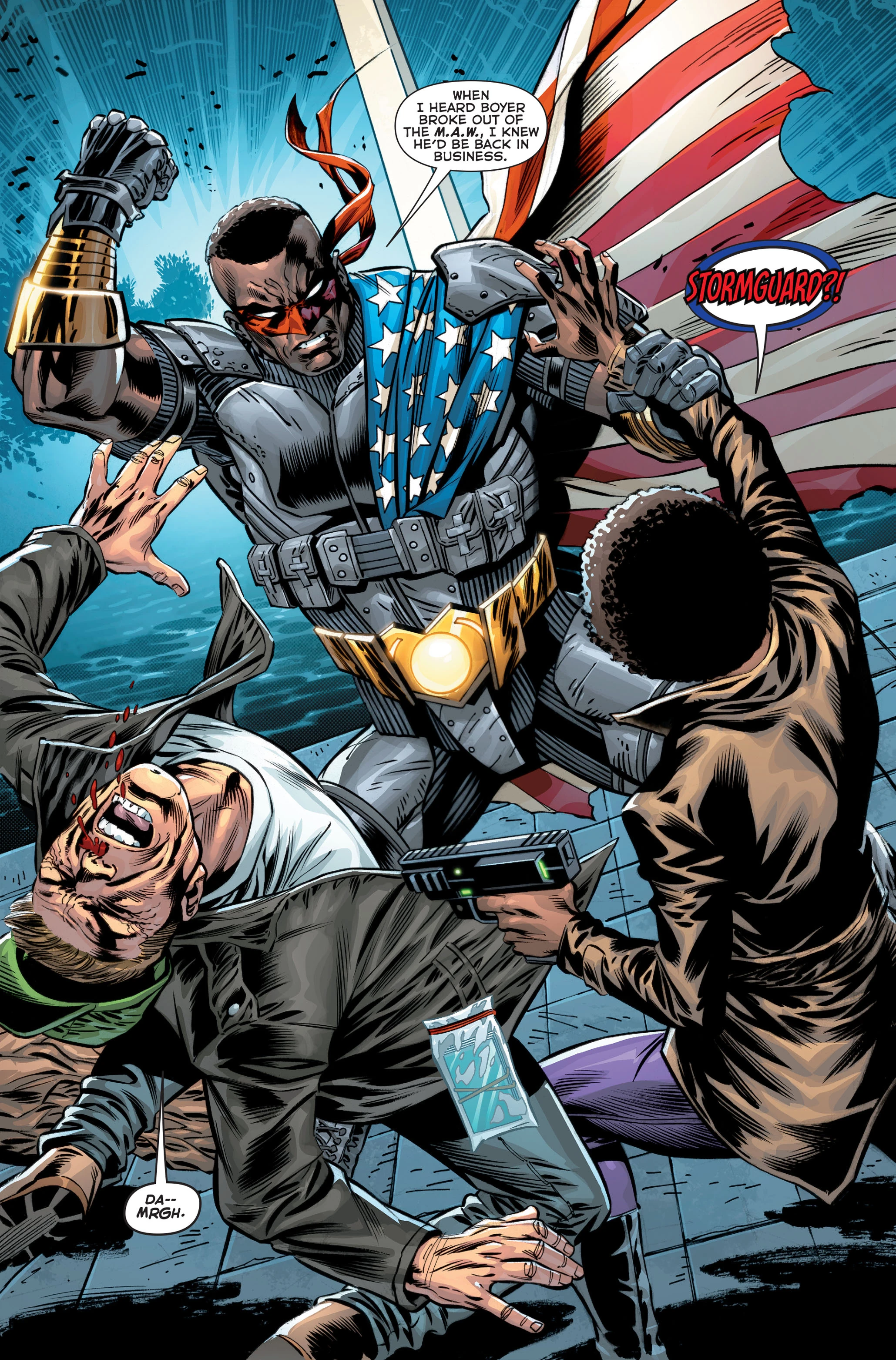 Stormguard is a member of the Justice League, five years into the future during the invasion of Brother Eye.
