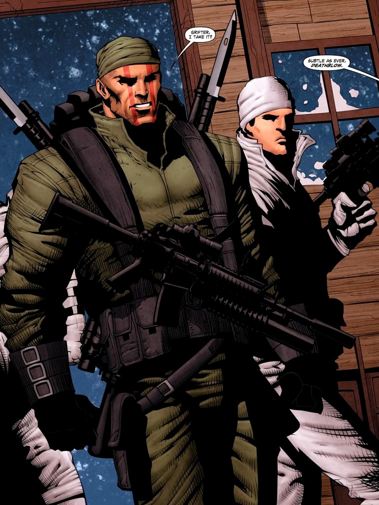 Deathblow is a black-ops soldier and mercenary in the Wildstorm Universe. Beginning his career as a member of the Navy SEALs, he gained powers through exposure to the Gen Factor. These abilities include psychokinesis and regeneration. He has been a member of Gen 12, International Operations, StormWatch, Team 6, Team 7 and Team LaSport. His daughter is Sublime of DV8 and his successor is female clone Genevieve Cray. There was also a predecessor of his named Collins using the same alias on Team Zero. Deathblow was created by Jim Lee and Brandon Choi, first appearing in Darker Image #1. (1993)