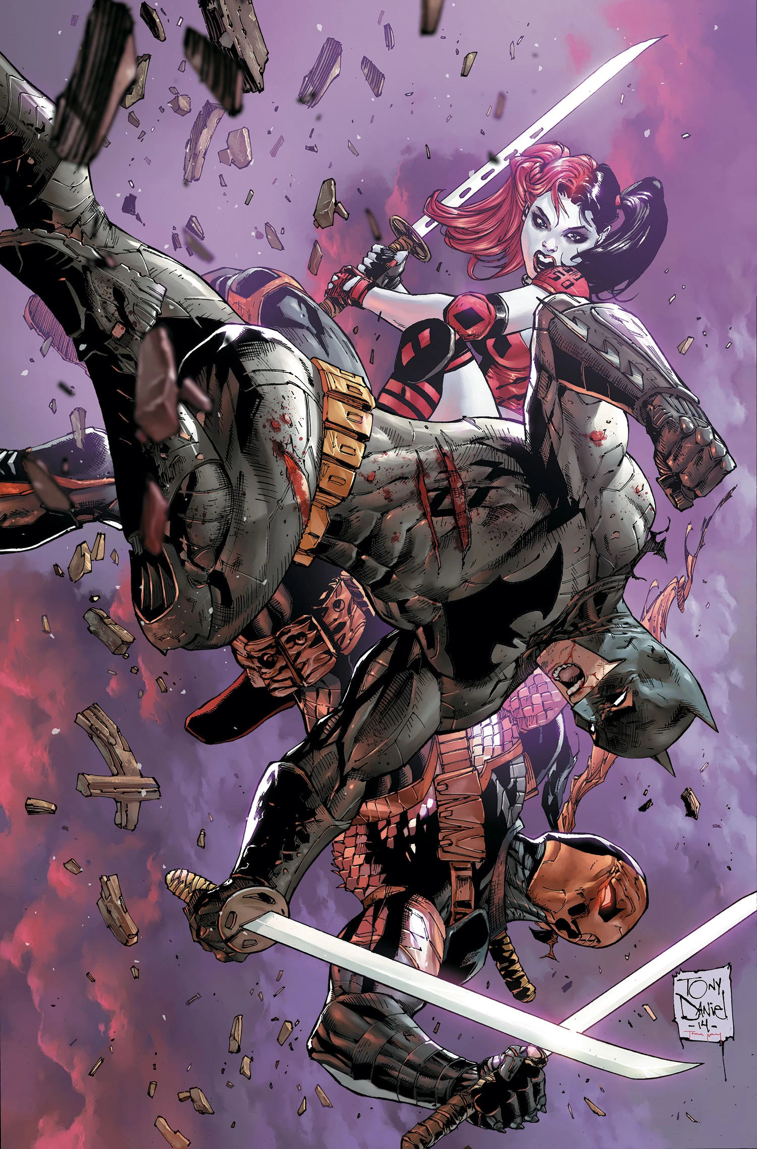 As revenge for betraying the Suicide Squad to the Russians, Harley Quinn has double-crossed Deathstroke, luring him into a fight with the Batman. Slade is impressed by his opponent's skill, and ability to match his brutality. He knows, though, that his advantage lies in the fact that he is willing to kill, while Batman is not. Still, his inexperience fighting with two eyes, puts him at a disadvantage, and frustrated, he warns Batman that he will hold him responsible if anything happens to his son, Jericho. Hearing this, Batman relents, realizing that he might have been duped by Harley as well. She offhandedly explains that Slade's son is in Gotham and in big trouble - but she doesn't care. They should kick each other's asses. Slade uses Batman's hesitation to overpower him with a cheap-shot, but when he nearly gets an opportunity to make a killing blow, Harley brings her mallet down on his head. While he and Batman resume their battle, Harley decides to take her leave, admitting that there is a bounty on Jericho's head that she intends to collect, and leaves them with several bombs, which soon go off and catch both men in the blast.