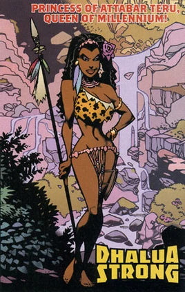 Dhalua Strong is the daughter of Attabar Teru's Chief Omotu, she married the famous Science Hero, Tom Strong when he returned to her island after his first American adventures.